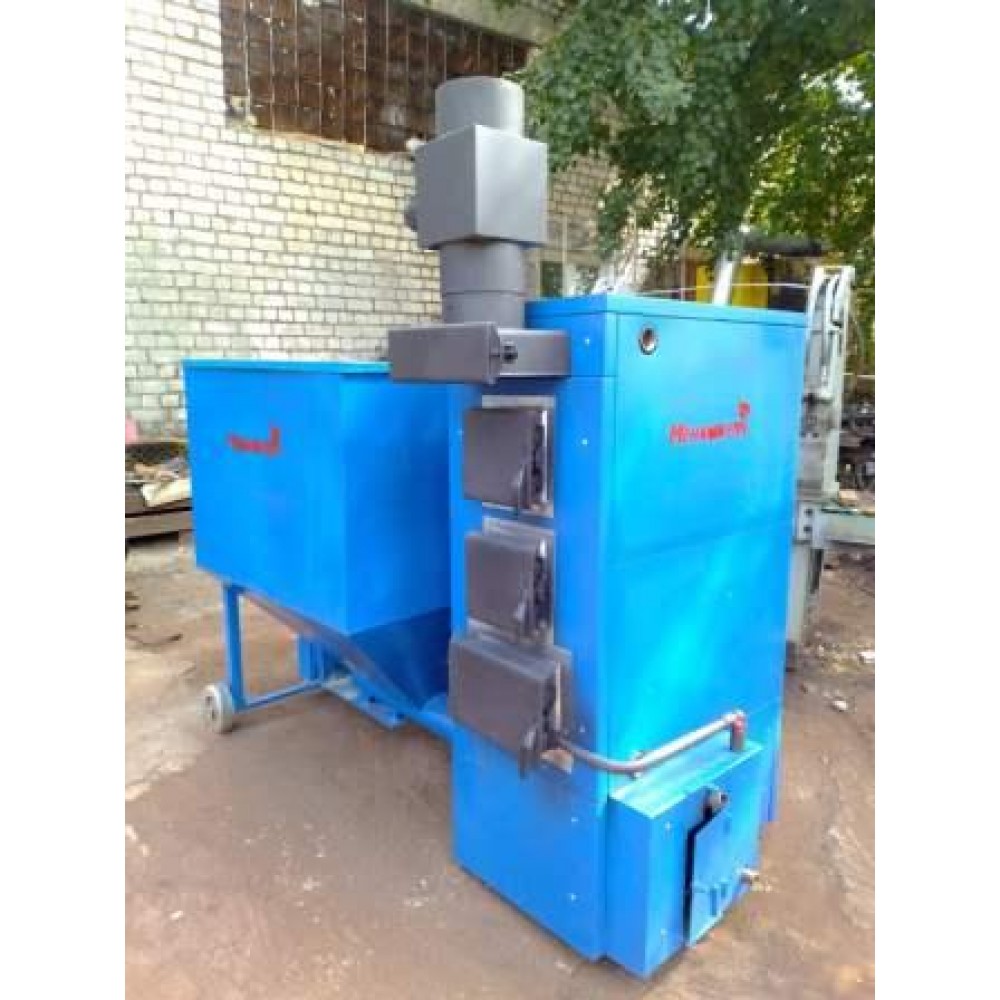 Твердотопливный Котел на древесных отходах 10-40 кВт длительного горения это Котлы твердотопливные для отопления жилых зданий и административно-бытовых сооружений. Принцип горения спички с "веру в низ" послужил для прототипа конструкции котла. Этот принцип горения позволяет гореть котлу на одой загрузке топлива от 12 до 40 и более часов. Котел и его конструкция разработаны таким образом, чтобы загруженное топливо- дрова, брикет, уголь горели только в вернем слое и постепенно пламя опускалось на нижние слои топлива. Воздухорапределитель равномерно подает кислород только на верхний слой углей, а когда котел нагревается, то подача воздуха прекращается и котел уходит в режим ожидания. Остальное топливо находится в безкислородной среде и гореть не может и под большой температурой выделяет из себя влагу что позволяет более эффективно сгорать. Даже во время интенсивного горения котел выдает большой КПД. Стенки котла и теплообменника подвержены меньшим температурным и линейным нагрузкам по сравнению с аналогичными котлами, что продевает срок эксплуатации котла. Экономия расхода топлива в сравнении с твердотопливными котлами прямого горения (как в костре) достигается за счет горения топлива с "верху в низ" и увеличивает КПД котла до 91,6 %. Большой коэффициент полезного действия (91,6%), инновационная конструкция котла, большое время горения, элегантный внешний вид, электронное управление горением, минимальное требование к дымоходу, простая схема обвязки котла - это огромные преимущества перед другими твердотопливными котлами.