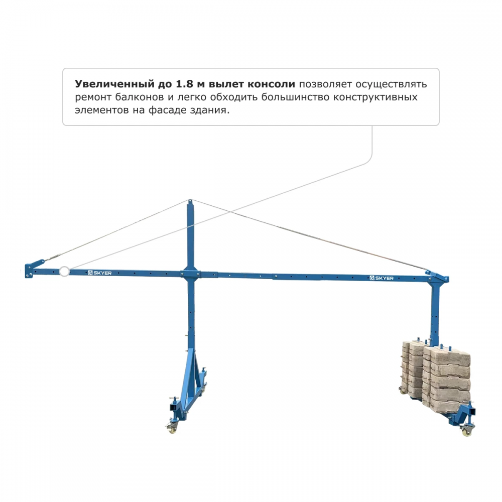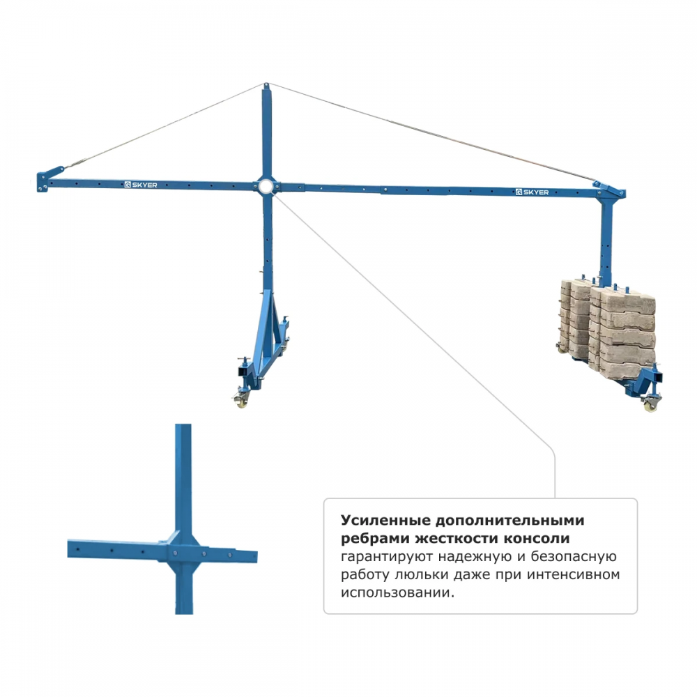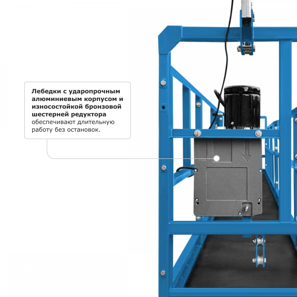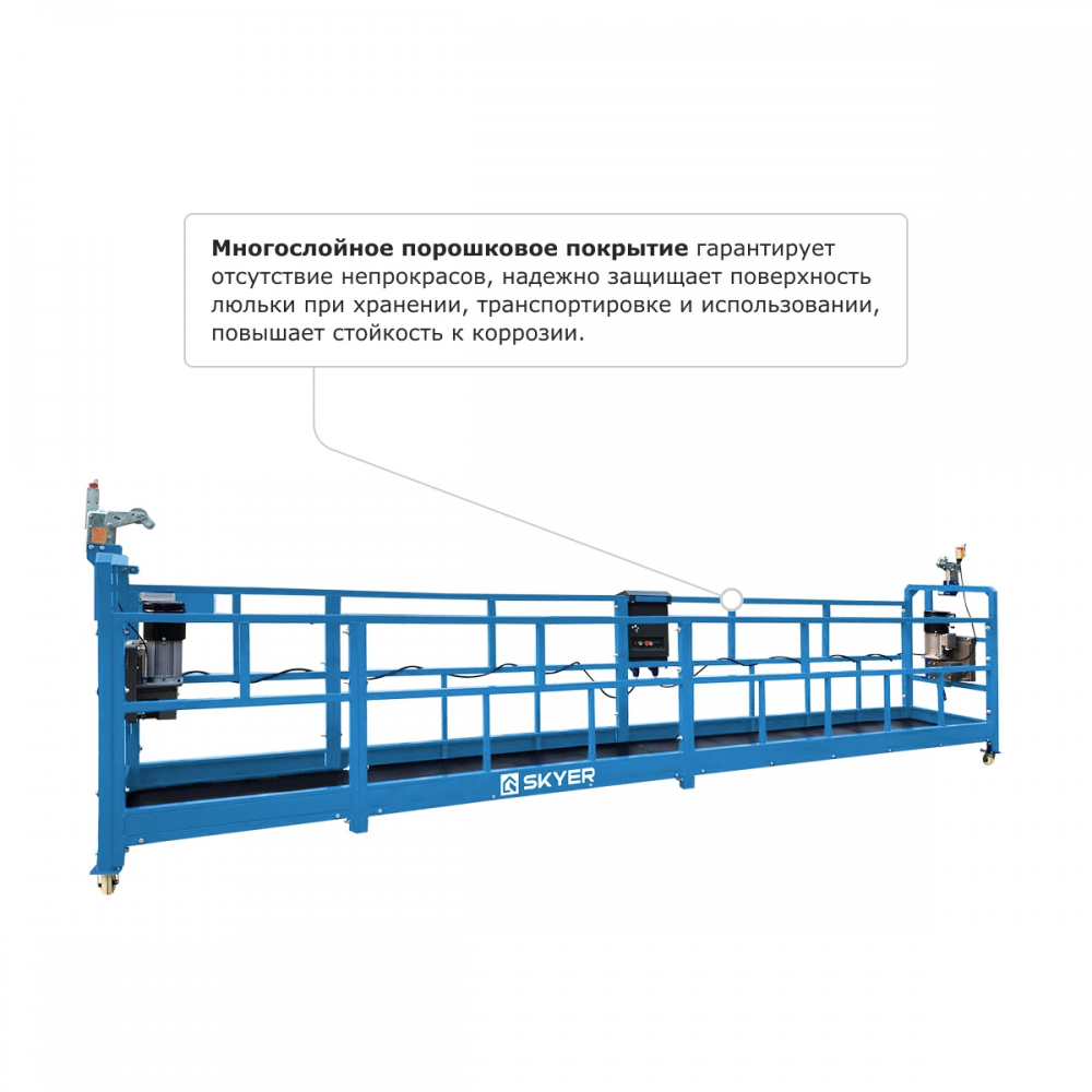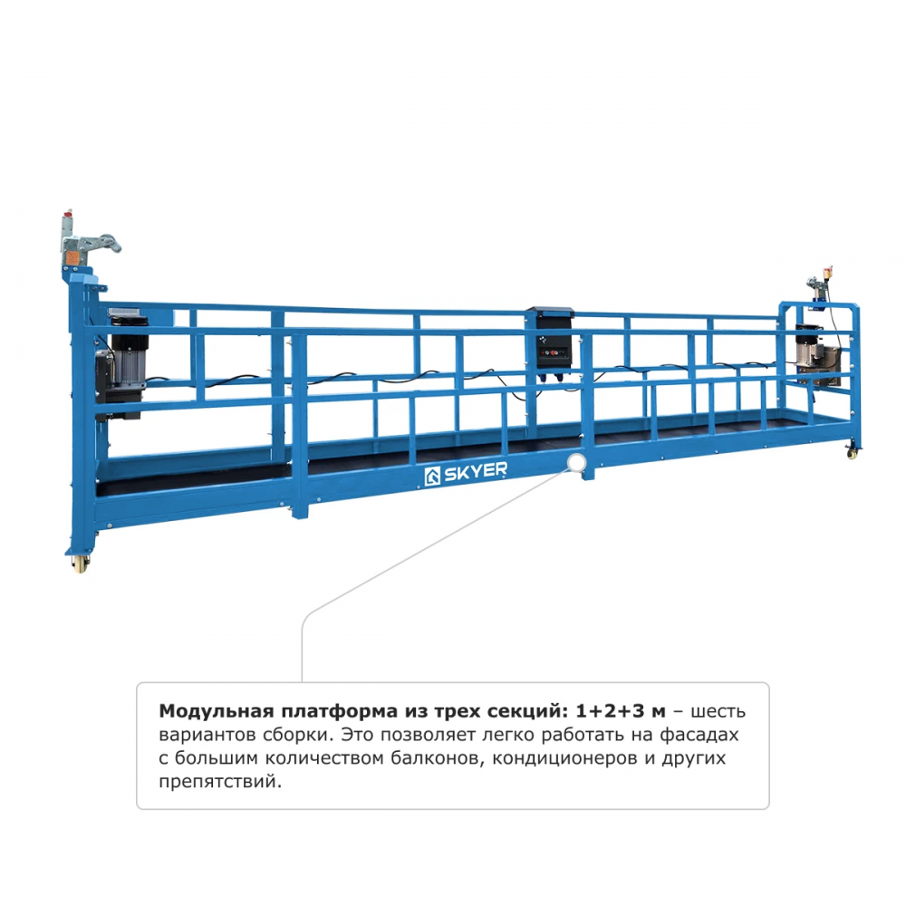 SKR 6 — усовершенствованный фасадный подъемник бренда SKYER. Отличается надежностью, высоким качеством исполнения и прочной конструкцией: увеличенная толщина профильной трубы обеспечивает долгий срок службы. Секции на 1, 2 и 3 метра дают возможность монтировать платформу разной длины, учитывая особенности конкретного сооружения. Надежная система ловителей и стальные тросы повышенной прочности защищают рабочих от обрывов и внештатных ситуаций. Грузоподъемность модели составляет 630 кг.
