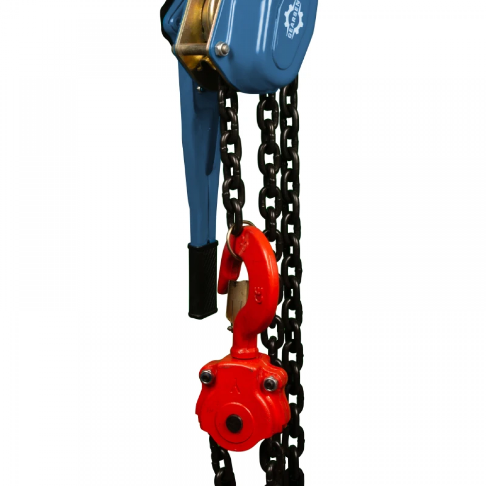 В тали установлено 2 подшипника качения для равномерного распределения нагрузки и долгого срока службы тали. Подъемной цепью служит калиброванная цепь стандарта G80 – надежная, с высоким ресурсом. Калибровка обеспечивает плавность подъёма. В комплект входят 2 заметных крюка с защелкой для безопасной фиксации грузов. Для лучшей фиксации в руке, ручка в данной модели обрезиненная.