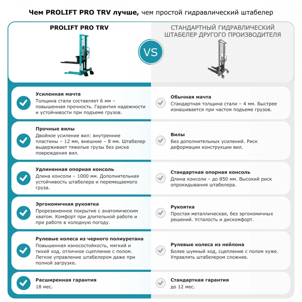 Гидравлический ручной штабелер TRV1525 относится к профессиональной складской технике. Способен работать при грузопотоке до 30 поддонов в смену. Отличается легкостью и простотой перемещения благодаря установленным рулевым поворотным колесам на 360° и удобным ручкам эргономичной формы. Техобслуживание колес облегчают установленные пресс-масленки подшипников. Важным элементом конструкции является стояночный тормоз. Грузоподъемность такого устройства равняется 1500 кг.